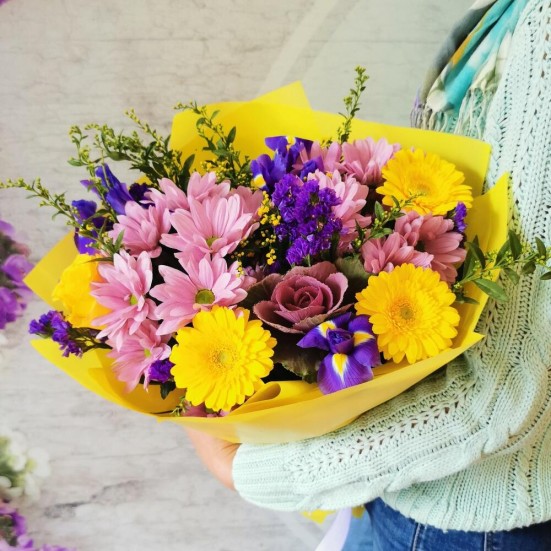 Букет с ирисами и хризантемами и герберами в Пушкино